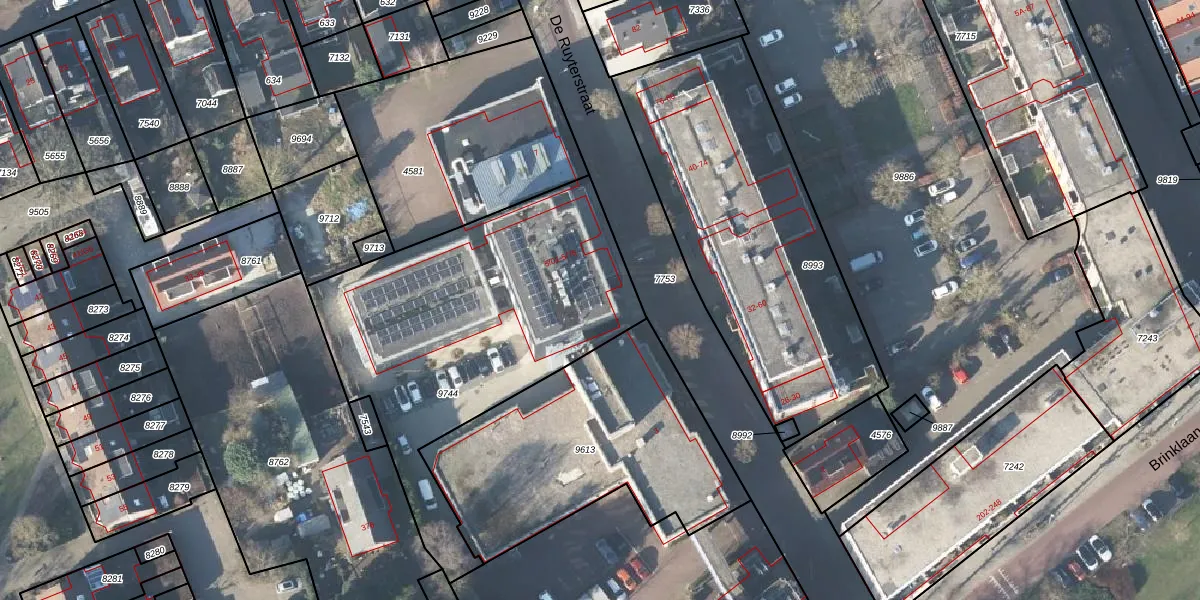 Het perceel waarop De Ruyterstraat 5-05 staat heeft een oppervlakte van 1599 m². Dit is een zeer groot perceel. De perceeloppervlakte wordt geregistreerd door het Kadaster. Gedetailleerde informatie over de maten van dit perceel kunt u vinden in het rapport Kadastrale kaart met maatvoering van De Ruyterstraat 5-05.