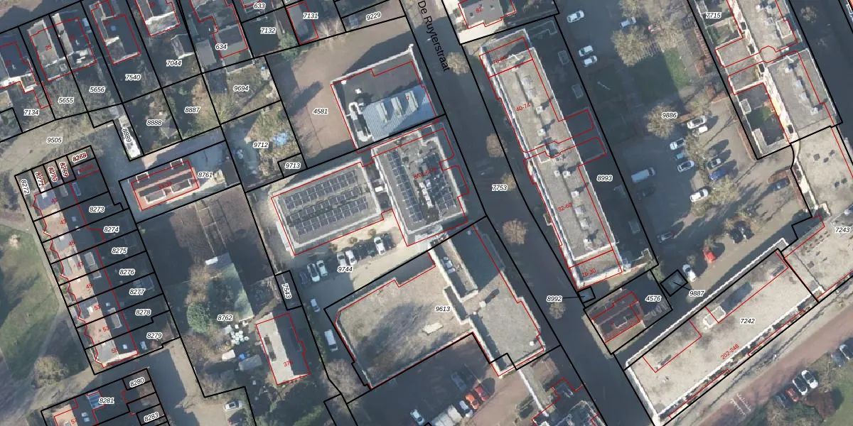 Het perceel waarop De Ruyterstraat 5-70 staat heeft een oppervlakte van 1599 m². Dit is een zeer groot perceel. De perceeloppervlakte wordt geregistreerd door het Kadaster. Gedetailleerde informatie over de maten van dit perceel kunt u vinden in het rapport Kadastrale kaart met maatvoering van De Ruyterstraat 5-70.