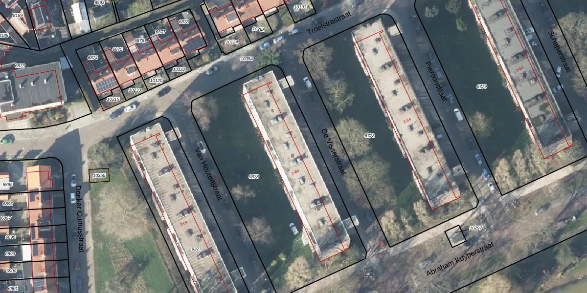 Het perceel waarop De Visserstraat 2-G3 staat heeft een oppervlakte van 2487 m². Dit is een zeer groot perceel. De perceeloppervlakte wordt geregistreerd door het Kadaster. Gedetailleerde informatie over de maten van dit perceel kunt u vinden in het rapport Kadastrale kaart met maatvoering van De Visserstraat 2-G3.