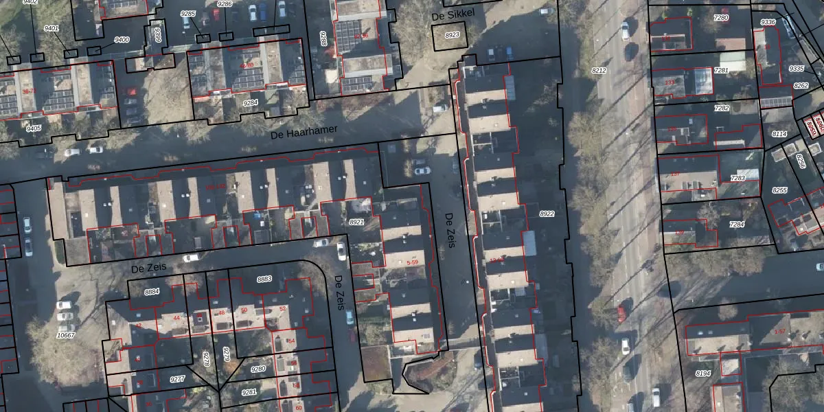 Het perceel waarop De Zeis 59 staat heeft een oppervlakte van 2516 m². Dit is een zeer groot perceel. De perceeloppervlakte wordt geregistreerd door het Kadaster. Gedetailleerde informatie over de maten van dit perceel kunt u vinden in het rapport Kadastrale kaart met maatvoering van De Zeis 59.
