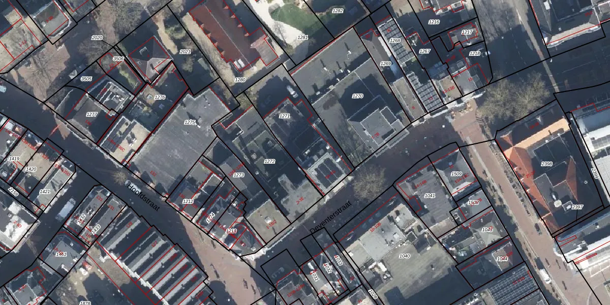 Het perceel waarop Deventerstraat 5-D staat heeft een oppervlakte van 645 m². Dit is een groot perceel. De perceeloppervlakte wordt geregistreerd door het Kadaster. Gedetailleerde informatie over de maten van dit perceel kunt u vinden in het rapport Kadastrale kaart met maatvoering van Deventerstraat 5-D.