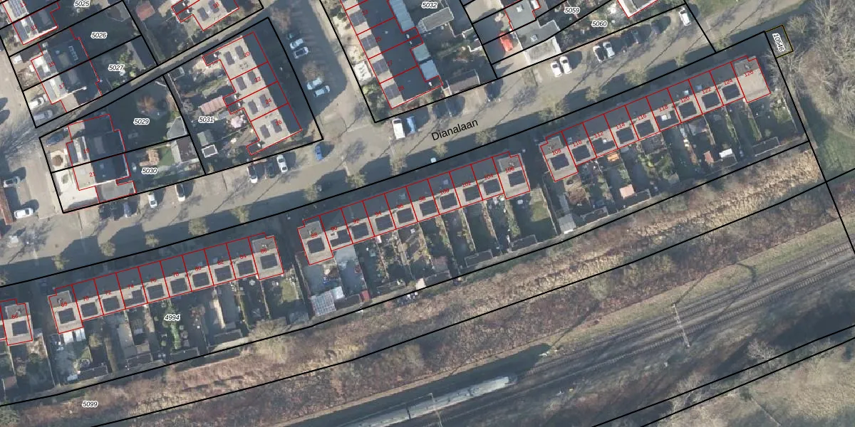 Het perceel waarop Dianalaan 98 staat heeft een oppervlakte van 8210 m². Dit is een zeer groot perceel. De perceeloppervlakte wordt geregistreerd door het Kadaster. Gedetailleerde informatie over de maten van dit perceel kunt u vinden in het rapport Kadastrale kaart met maatvoering van Dianalaan 98.