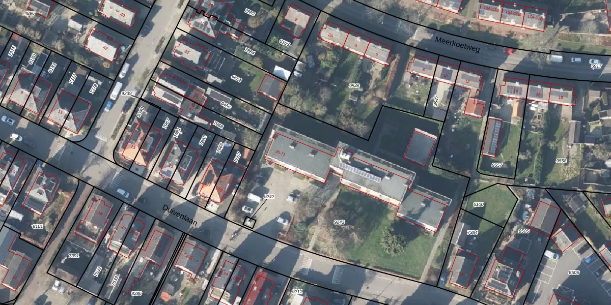 Het perceel waarop Duivenlaan 53 staat heeft een oppervlakte van 3102 m². Dit is een zeer groot perceel. De perceeloppervlakte wordt geregistreerd door het Kadaster. Gedetailleerde informatie over de maten van dit perceel kunt u vinden in het rapport Kadastrale kaart met maatvoering van Duivenlaan 53.
