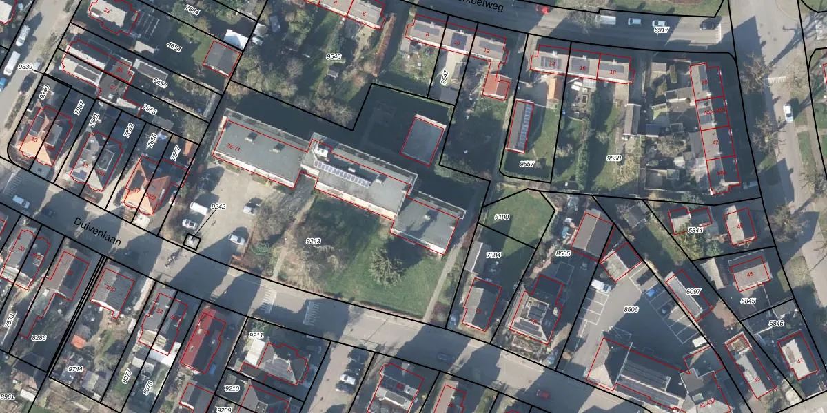 Het perceel waarop Duivenlaan 63 staat heeft een oppervlakte van 3102 m². Dit is een zeer groot perceel. De perceeloppervlakte wordt geregistreerd door het Kadaster. Gedetailleerde informatie over de maten van dit perceel kunt u vinden in het rapport Kadastrale kaart met maatvoering van Duivenlaan 63.