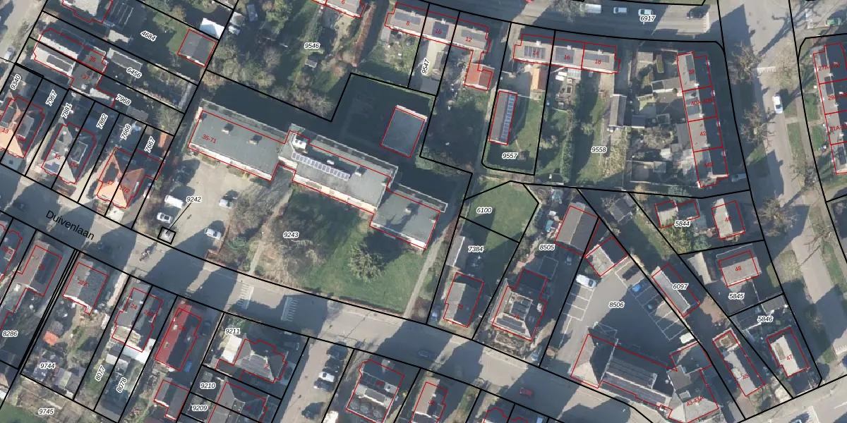 Het perceel waarop Duivenlaan 65 staat heeft een oppervlakte van 3102 m². Dit is een zeer groot perceel. De perceeloppervlakte wordt geregistreerd door het Kadaster. Gedetailleerde informatie over de maten van dit perceel kunt u vinden in het rapport Kadastrale kaart met maatvoering van Duivenlaan 65.