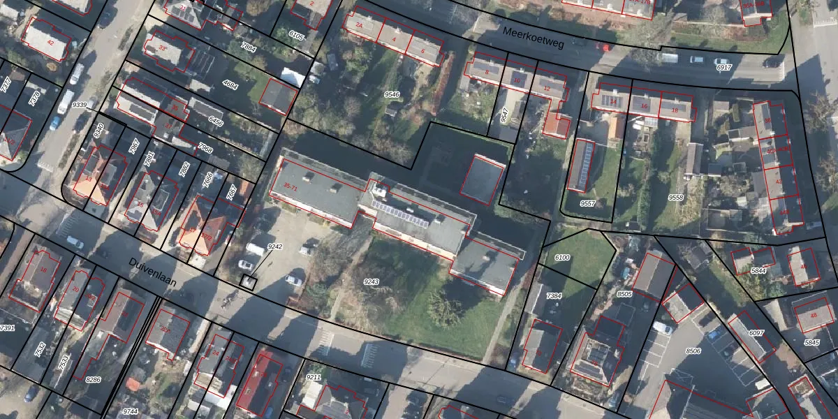 Het perceel waarop Duivenlaan 69 staat heeft een oppervlakte van 3102 m². Dit is een zeer groot perceel. De perceeloppervlakte wordt geregistreerd door het Kadaster. Gedetailleerde informatie over de maten van dit perceel kunt u vinden in het rapport Kadastrale kaart met maatvoering van Duivenlaan 69.