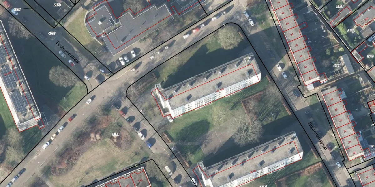 Het perceel waarop Eburonenstraat 105 staat heeft een oppervlakte van 1,0 ha. Dit is een zeer groot perceel. De perceeloppervlakte wordt geregistreerd door het Kadaster. Gedetailleerde informatie over de maten van dit perceel kunt u vinden in het rapport Kadastrale kaart met maatvoering van Eburonenstraat 105.