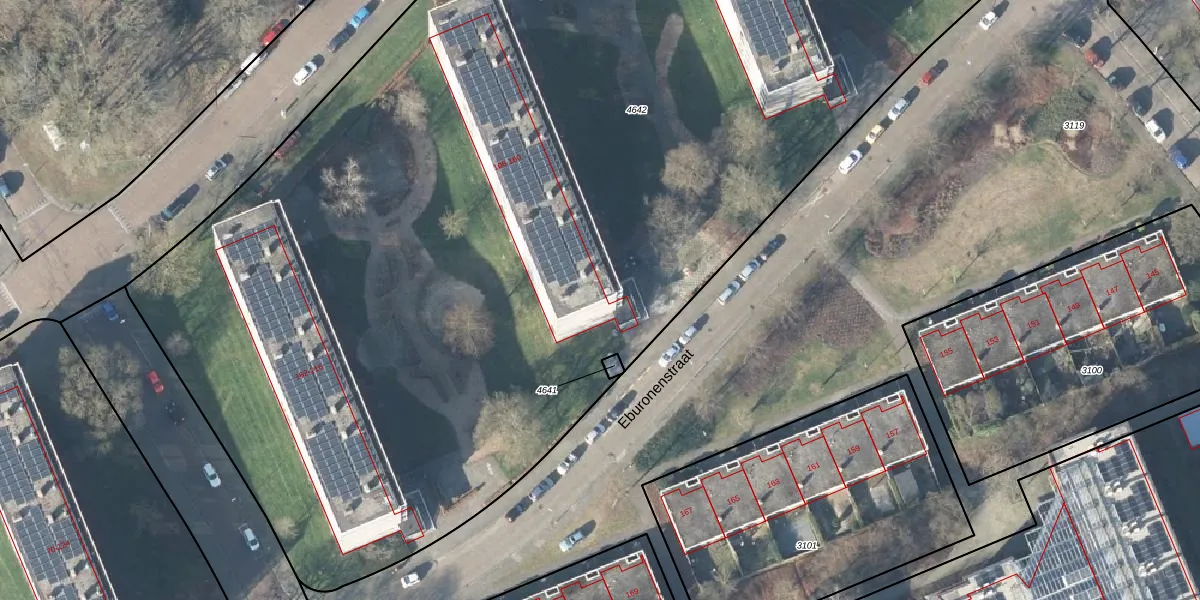 Het perceel waarop Eburonenstraat 106 staat heeft een oppervlakte van 9725 m². Dit is een zeer groot perceel. De perceeloppervlakte wordt geregistreerd door het Kadaster. Gedetailleerde informatie over de maten van dit perceel kunt u vinden in het rapport Kadastrale kaart met maatvoering van Eburonenstraat 106.