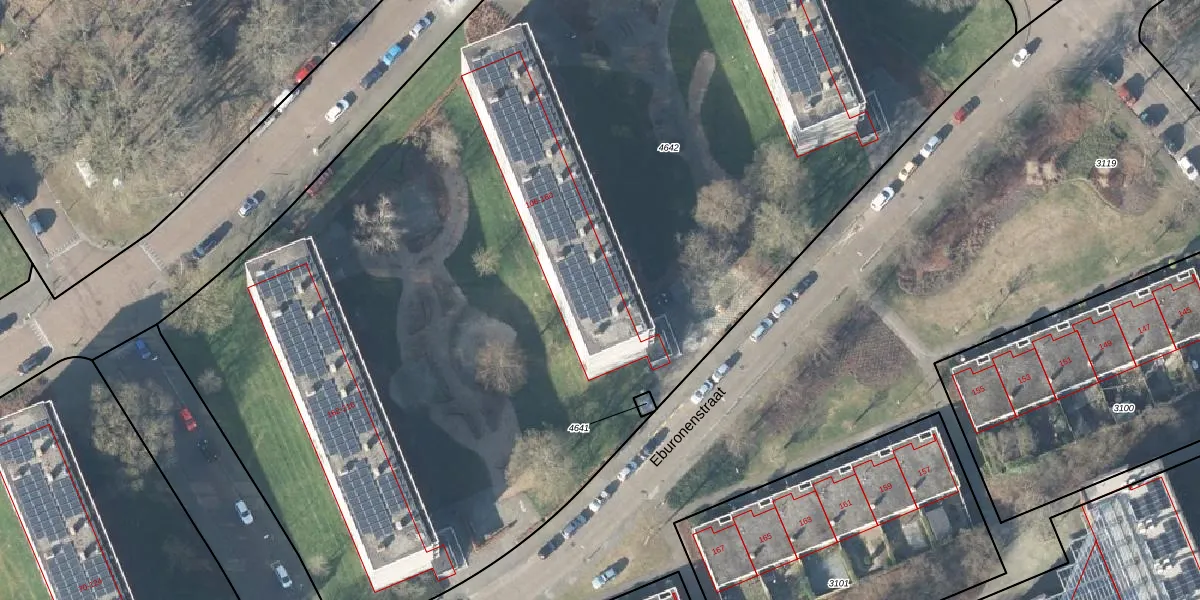 Het perceel waarop Eburonenstraat 122 staat heeft een oppervlakte van 9725 m². Dit is een zeer groot perceel. De perceeloppervlakte wordt geregistreerd door het Kadaster. Gedetailleerde informatie over de maten van dit perceel kunt u vinden in het rapport Kadastrale kaart met maatvoering van Eburonenstraat 122.