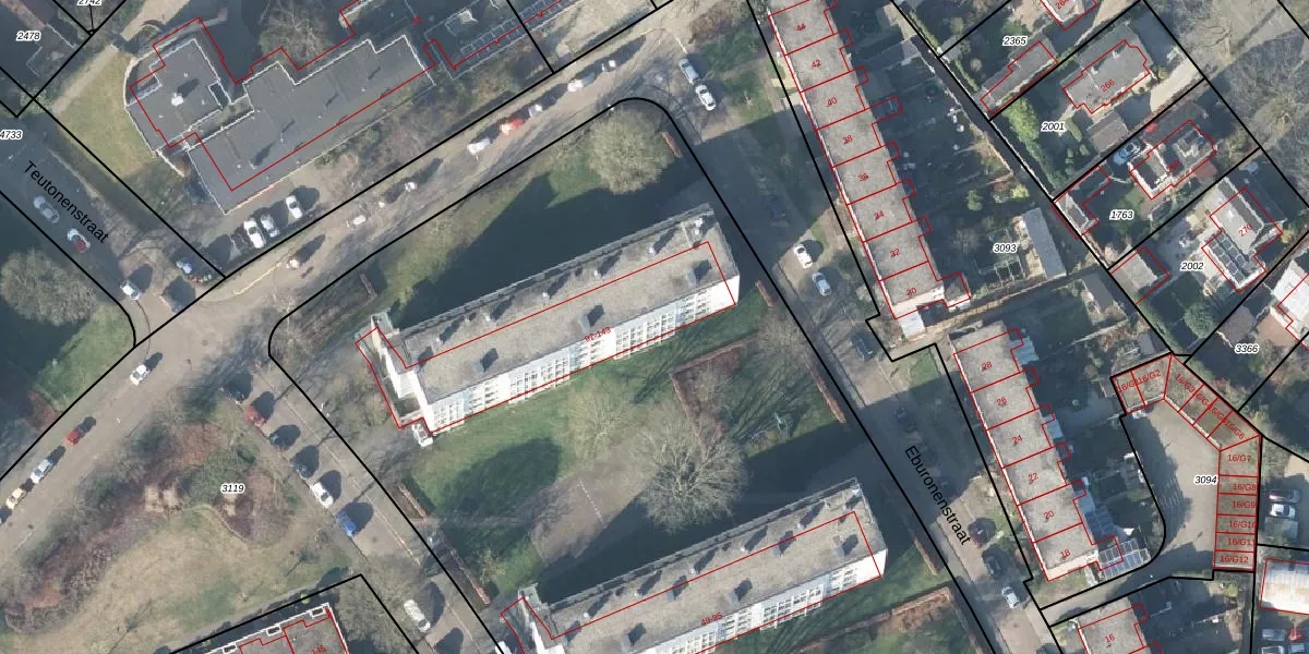 Het perceel waarop Eburonenstraat 135 staat heeft een oppervlakte van 1,0 ha. Dit is een zeer groot perceel. De perceeloppervlakte wordt geregistreerd door het Kadaster. Gedetailleerde informatie over de maten van dit perceel kunt u vinden in het rapport Kadastrale kaart met maatvoering van Eburonenstraat 135.