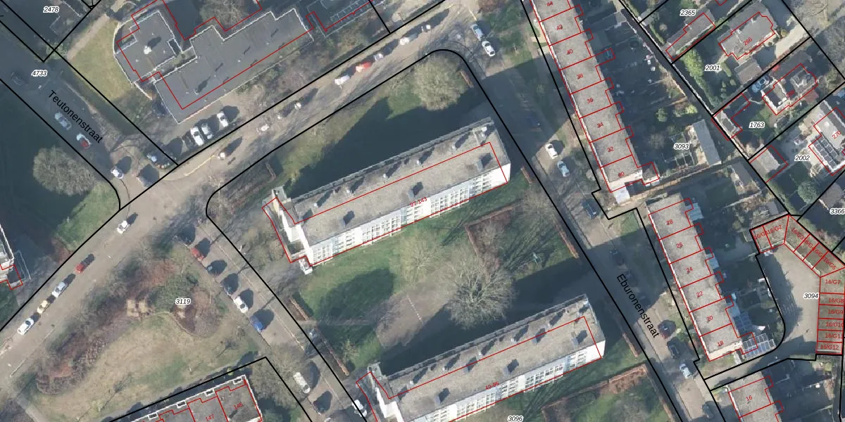 Het perceel waarop Eburonenstraat 137 staat heeft een oppervlakte van 1,0 ha. Dit is een zeer groot perceel. De perceeloppervlakte wordt geregistreerd door het Kadaster. Gedetailleerde informatie over de maten van dit perceel kunt u vinden in het rapport Kadastrale kaart met maatvoering van Eburonenstraat 137.