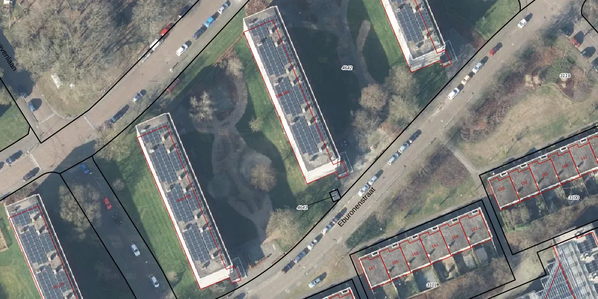 Het perceel waarop Eburonenstraat 150 staat heeft een oppervlakte van 9725 m². Dit is een zeer groot perceel. De perceeloppervlakte wordt geregistreerd door het Kadaster. Gedetailleerde informatie over de maten van dit perceel kunt u vinden in het rapport Kadastrale kaart met maatvoering van Eburonenstraat 150.
