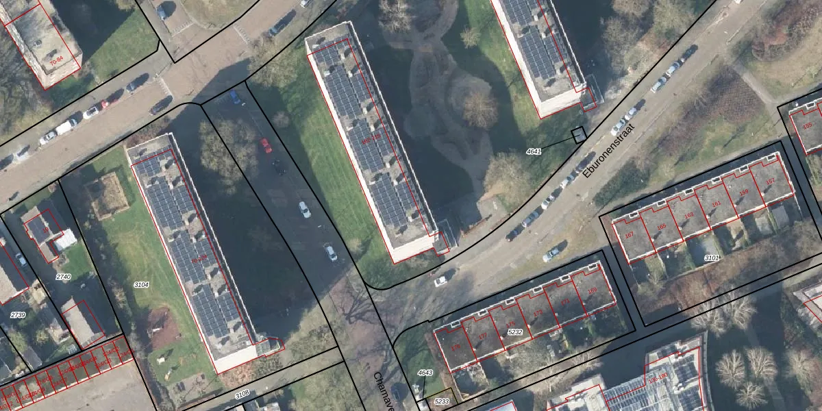 Het perceel waarop Eburonenstraat 164 staat heeft een oppervlakte van 9725 m². Dit is een zeer groot perceel. De perceeloppervlakte wordt geregistreerd door het Kadaster. Gedetailleerde informatie over de maten van dit perceel kunt u vinden in het rapport Kadastrale kaart met maatvoering van Eburonenstraat 164.