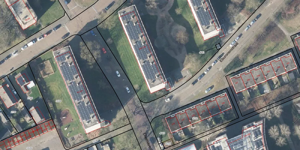 Het perceel waarop Eburonenstraat 192 staat heeft een oppervlakte van 9725 m². Dit is een zeer groot perceel. De perceeloppervlakte wordt geregistreerd door het Kadaster. Gedetailleerde informatie over de maten van dit perceel kunt u vinden in het rapport Kadastrale kaart met maatvoering van Eburonenstraat 192.