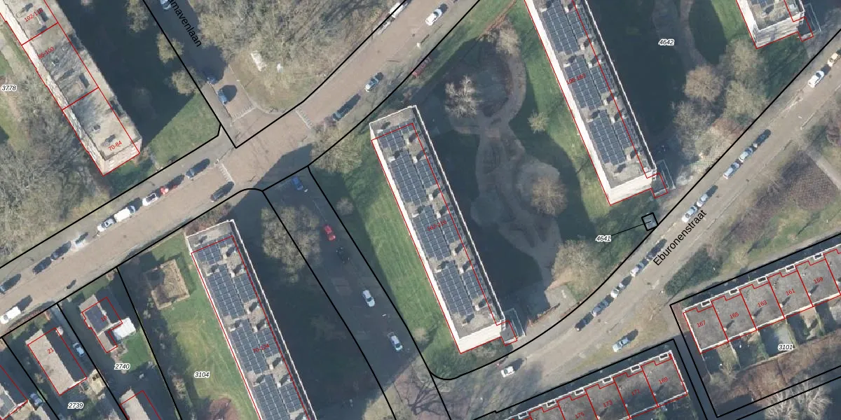 Het perceel waarop Eburonenstraat 198 staat heeft een oppervlakte van 9725 m². Dit is een zeer groot perceel. De perceeloppervlakte wordt geregistreerd door het Kadaster. Gedetailleerde informatie over de maten van dit perceel kunt u vinden in het rapport Kadastrale kaart met maatvoering van Eburonenstraat 198.