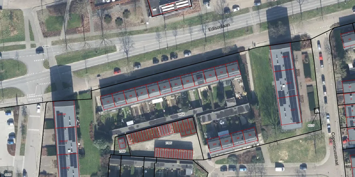 Het perceel waarop Edisonlaan 61 staat heeft een oppervlakte van 7360 m². Dit is een zeer groot perceel. De perceeloppervlakte wordt geregistreerd door het Kadaster. Gedetailleerde informatie over de maten van dit perceel kunt u vinden in het rapport Kadastrale kaart met maatvoering van Edisonlaan 61.