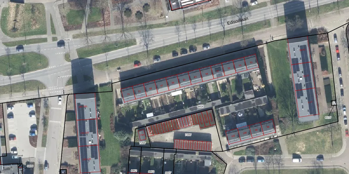 Het perceel waarop Edisonlaan 65 staat heeft een oppervlakte van 7360 m². Dit is een zeer groot perceel. De perceeloppervlakte wordt geregistreerd door het Kadaster. Gedetailleerde informatie over de maten van dit perceel kunt u vinden in het rapport Kadastrale kaart met maatvoering van Edisonlaan 65.