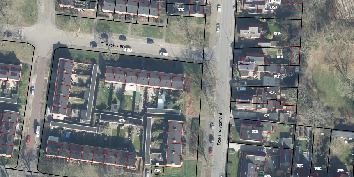 Het perceel waarop Einsteinlaan 1 staat heeft een oppervlakte van 6328 m². Dit is een zeer groot perceel. De perceeloppervlakte wordt geregistreerd door het Kadaster. Gedetailleerde informatie over de maten van dit perceel kunt u vinden in het rapport Kadastrale kaart met maatvoering van Einsteinlaan 1.
