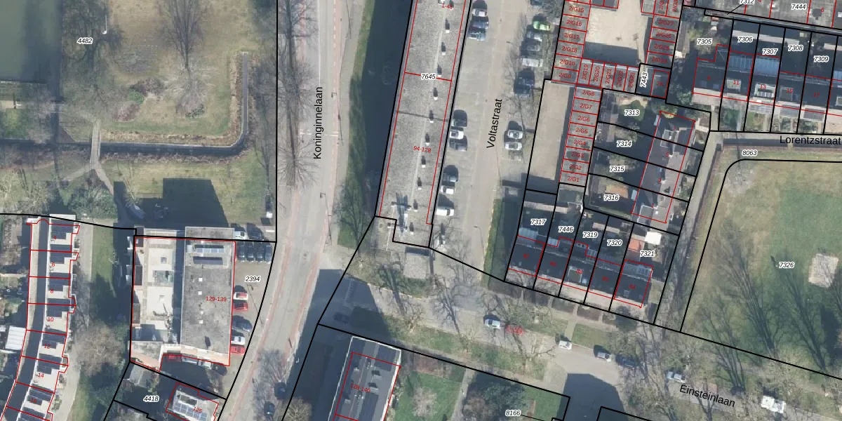Het perceel waarop Einsteinlaan 94 staat heeft een oppervlakte van 1043 m². Dit is een zeer groot perceel. De perceeloppervlakte wordt geregistreerd door het Kadaster. Gedetailleerde informatie over de maten van dit perceel kunt u vinden in het rapport Kadastrale kaart met maatvoering van Einsteinlaan 94.