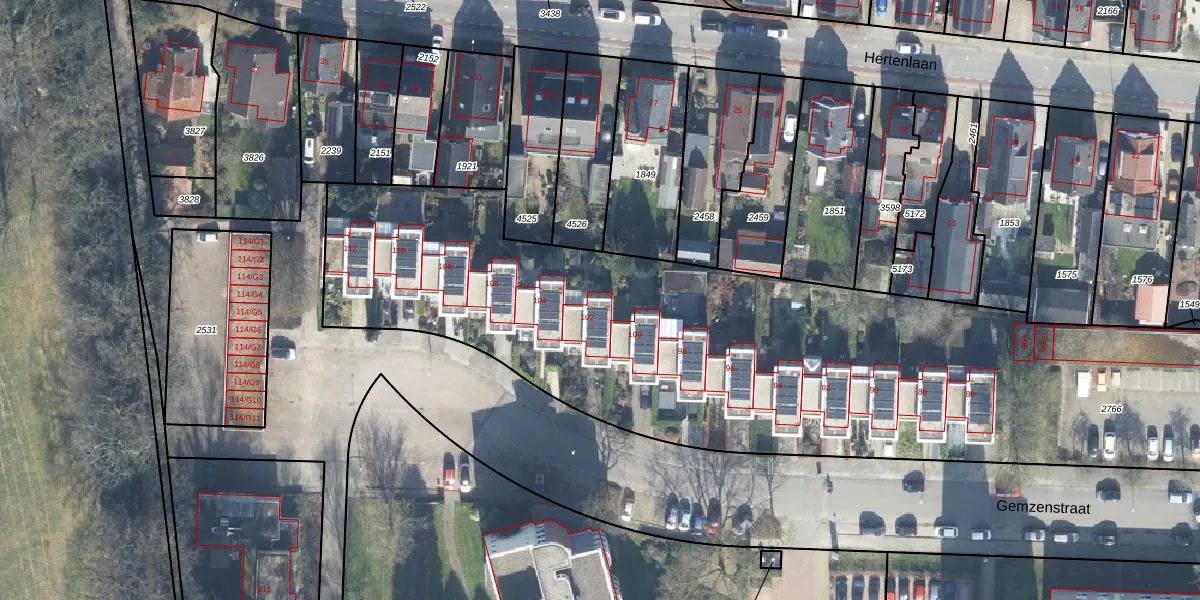 Het perceel waarop Gemzenstraat 102 staat heeft een oppervlakte van 6079 m². Dit is een zeer groot perceel. De perceeloppervlakte wordt geregistreerd door het Kadaster. Gedetailleerde informatie over de maten van dit perceel kunt u vinden in het rapport Kadastrale kaart met maatvoering van Gemzenstraat 102.