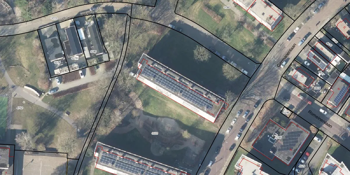 Het perceel waarop Germanenlaan 232 staat heeft een oppervlakte van 1,0 ha. Dit is een zeer groot perceel. De perceeloppervlakte wordt geregistreerd door het Kadaster. Gedetailleerde informatie over de maten van dit perceel kunt u vinden in het rapport Kadastrale kaart met maatvoering van Germanenlaan 232.