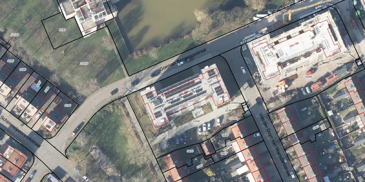 Het perceel waarop Goeman Borgesiusstraat 26-B staat heeft een oppervlakte van 2204 m². Dit is een zeer groot perceel. De perceeloppervlakte wordt geregistreerd door het Kadaster. Gedetailleerde informatie over de maten van dit perceel kunt u vinden in het rapport Kadastrale kaart met maatvoering van Goeman Borgesiusstraat 26-B.