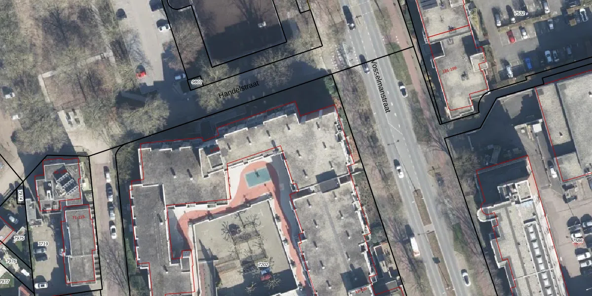 Het perceel waarop Handelstraat 101 staat heeft een oppervlakte van 8195 m². Dit is een zeer groot perceel. De perceeloppervlakte wordt geregistreerd door het Kadaster. Gedetailleerde informatie over de maten van dit perceel kunt u vinden in het rapport Kadastrale kaart met maatvoering van Handelstraat 101.