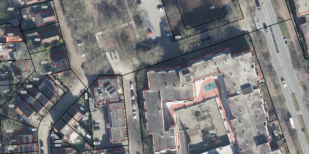 Het perceel waarop Handelstraat 151 staat heeft een oppervlakte van 8195 m². Dit is een zeer groot perceel. De perceeloppervlakte wordt geregistreerd door het Kadaster. Gedetailleerde informatie over de maten van dit perceel kunt u vinden in het rapport Kadastrale kaart met maatvoering van Handelstraat 151.
