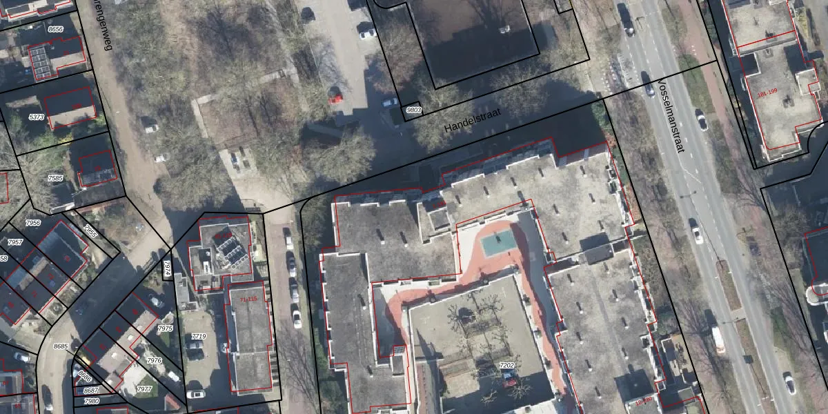 Het perceel waarop Handelstraat 155 staat heeft een oppervlakte van 8195 m². Dit is een zeer groot perceel. De perceeloppervlakte wordt geregistreerd door het Kadaster. Gedetailleerde informatie over de maten van dit perceel kunt u vinden in het rapport Kadastrale kaart met maatvoering van Handelstraat 155.