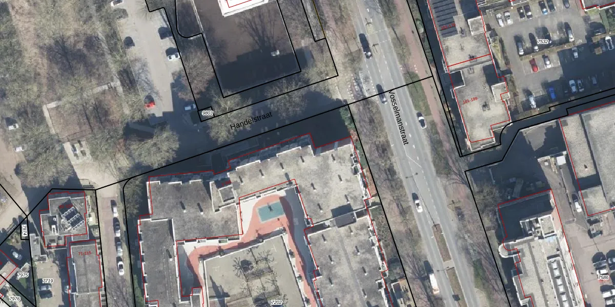 Het perceel waarop Handelstraat 163 staat heeft een oppervlakte van 8195 m². Dit is een zeer groot perceel. De perceeloppervlakte wordt geregistreerd door het Kadaster. Gedetailleerde informatie over de maten van dit perceel kunt u vinden in het rapport Kadastrale kaart met maatvoering van Handelstraat 163.