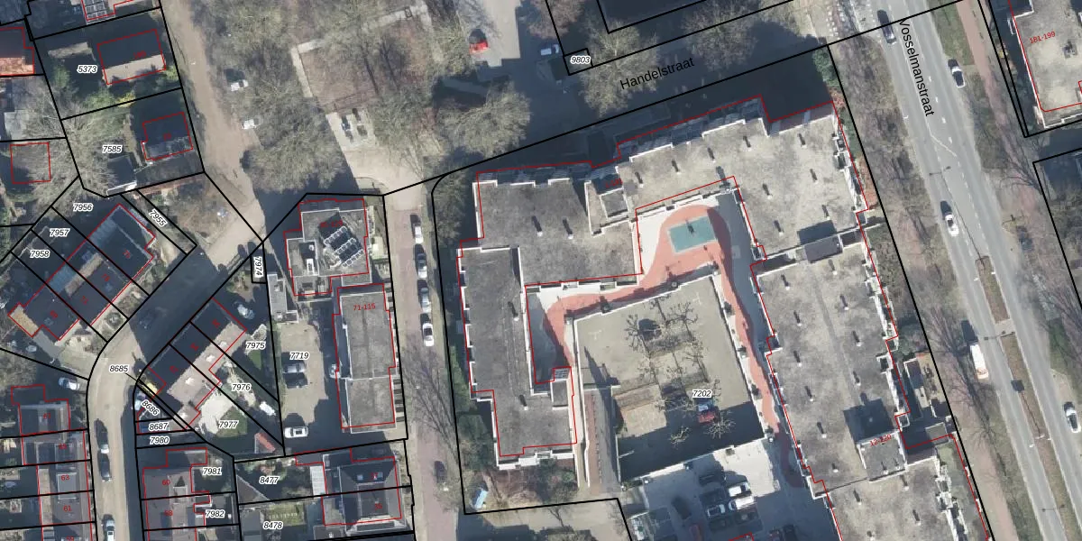 Het perceel waarop Handelstraat 23 staat heeft een oppervlakte van 8195 m². Dit is een zeer groot perceel. De perceeloppervlakte wordt geregistreerd door het Kadaster. Gedetailleerde informatie over de maten van dit perceel kunt u vinden in het rapport Kadastrale kaart met maatvoering van Handelstraat 23.