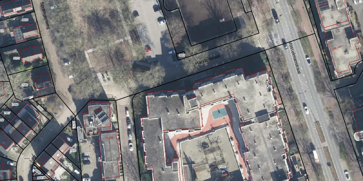 Het perceel waarop Handelstraat 41 staat heeft een oppervlakte van 8195 m². Dit is een zeer groot perceel. De perceeloppervlakte wordt geregistreerd door het Kadaster. Gedetailleerde informatie over de maten van dit perceel kunt u vinden in het rapport Kadastrale kaart met maatvoering van Handelstraat 41.