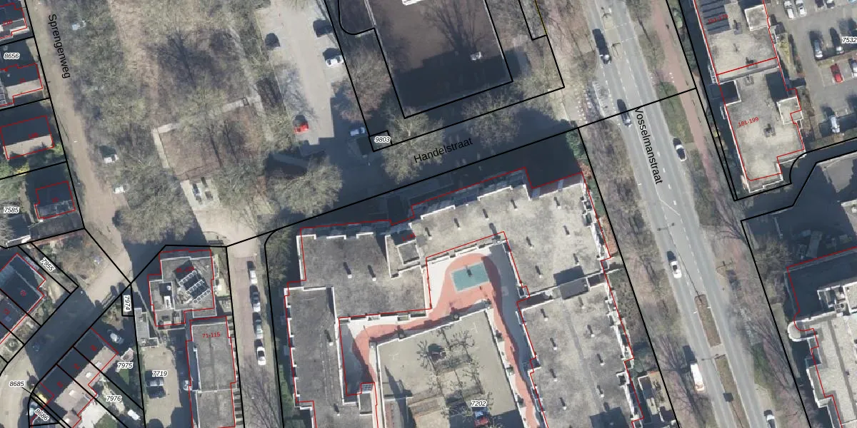 Het perceel waarop Handelstraat 43 staat heeft een oppervlakte van 8195 m². Dit is een zeer groot perceel. De perceeloppervlakte wordt geregistreerd door het Kadaster. Gedetailleerde informatie over de maten van dit perceel kunt u vinden in het rapport Kadastrale kaart met maatvoering van Handelstraat 43.