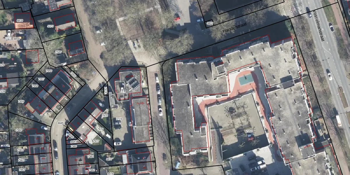 Het perceel waarop Handelstraat 77 staat heeft een oppervlakte van 8195 m². Dit is een zeer groot perceel. De perceeloppervlakte wordt geregistreerd door het Kadaster. Gedetailleerde informatie over de maten van dit perceel kunt u vinden in het rapport Kadastrale kaart met maatvoering van Handelstraat 77.