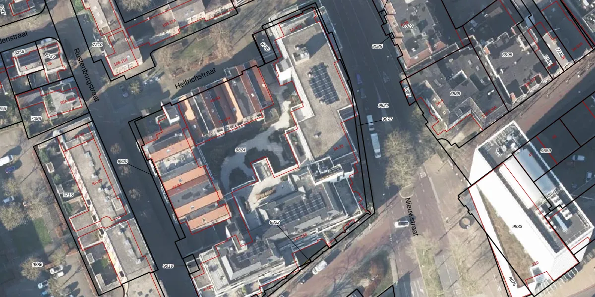 Het perceel waarop Helfrichstraat 1-E staat heeft een oppervlakte van 4719 m². Dit is een zeer groot perceel. De perceeloppervlakte wordt geregistreerd door het Kadaster. Gedetailleerde informatie over de maten van dit perceel kunt u vinden in het rapport Kadastrale kaart met maatvoering van Helfrichstraat 1-E.