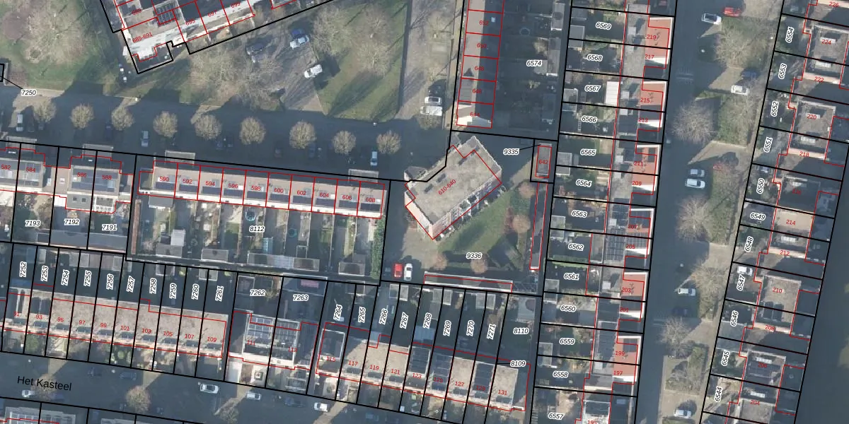 Het perceel waarop Het Kasteel 618 staat heeft een oppervlakte van 1202 m². Dit is een zeer groot perceel. De perceeloppervlakte wordt geregistreerd door het Kadaster. Gedetailleerde informatie over de maten van dit perceel kunt u vinden in het rapport Kadastrale kaart met maatvoering van Het Kasteel 618.