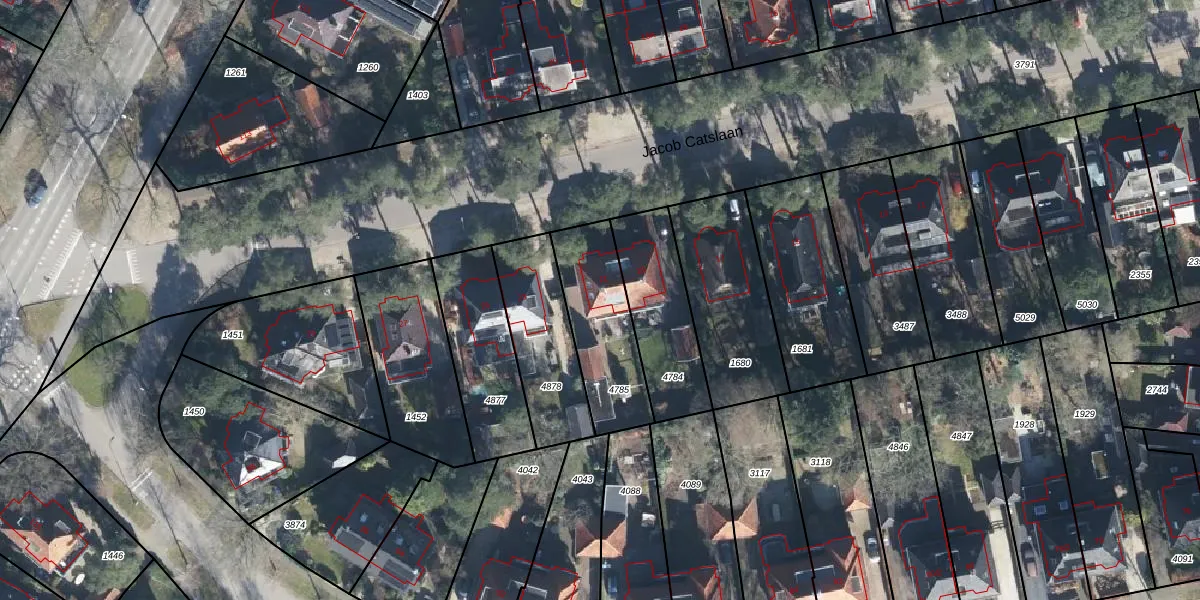 Het perceel waarop Jacob Catslaan 21 staat heeft een oppervlakte van 355 m². Dit is een groot perceel. De perceeloppervlakte wordt geregistreerd door het Kadaster. Gedetailleerde informatie over de maten van dit perceel kunt u vinden in het rapport Kadastrale kaart met maatvoering van Jacob Catslaan 21.