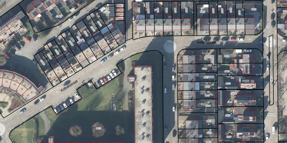 Het perceel waarop Kobaltstraat 53 staat heeft een oppervlakte van 6645 m². Dit is een zeer groot perceel. De perceeloppervlakte wordt geregistreerd door het Kadaster. Gedetailleerde informatie over de maten van dit perceel kunt u vinden in het rapport Kadastrale kaart met maatvoering van Kobaltstraat 53.