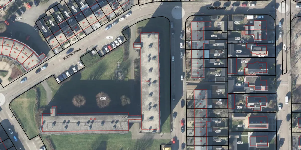 Het perceel waarop Kobaltstraat 59 staat heeft een oppervlakte van 6645 m². Dit is een zeer groot perceel. De perceeloppervlakte wordt geregistreerd door het Kadaster. Gedetailleerde informatie over de maten van dit perceel kunt u vinden in het rapport Kadastrale kaart met maatvoering van Kobaltstraat 59.