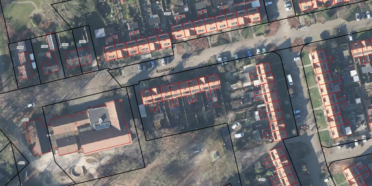 Kooiweg 19 is gelegen op kadastraal perceel SRN00R3329. Deze kadastrale aanduiding is uniek en wordt gebruikt door het Kadaster om eigendomsrechten en andere zakelijke rechten vast te leggen. Het perceel maakt onderdeel uit van de kadastrale gemeente Hoog Soeren.