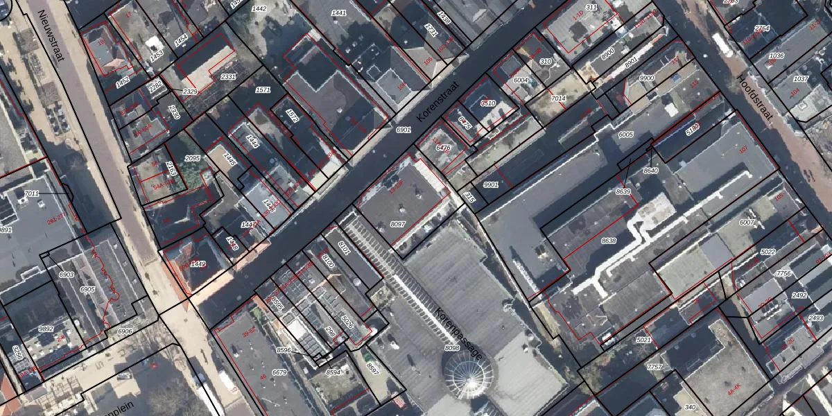 Het perceel waarop Korenstraat 13-E staat heeft een oppervlakte van 390 m². Dit is een groot perceel. De perceeloppervlakte wordt geregistreerd door het Kadaster. Gedetailleerde informatie over de maten van dit perceel kunt u vinden in het rapport Kadastrale kaart met maatvoering van Korenstraat 13-E.
