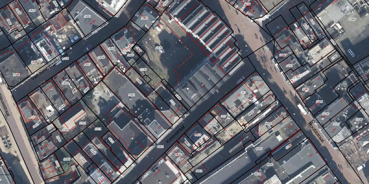 Het perceel waarop Korenstraat 42 staat heeft een oppervlakte van 2056 m². Dit is een zeer groot perceel. De perceeloppervlakte wordt geregistreerd door het Kadaster. Gedetailleerde informatie over de maten van dit perceel kunt u vinden in het rapport Kadastrale kaart met maatvoering van Korenstraat 42.