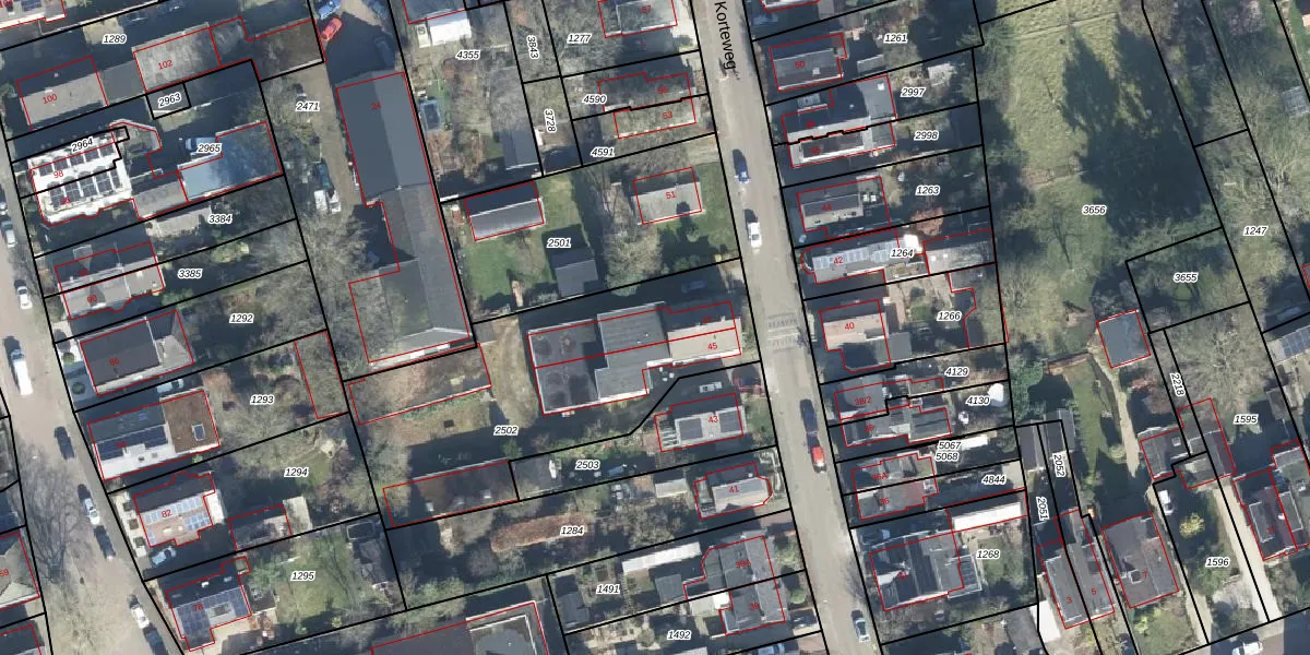Het perceel waarop Korteweg 47 staat heeft een oppervlakte van 1303 m². Dit is een zeer groot perceel. De perceeloppervlakte wordt geregistreerd door het Kadaster. Gedetailleerde informatie over de maten van dit perceel kunt u vinden in het rapport Kadastrale kaart met maatvoering van Korteweg 47.