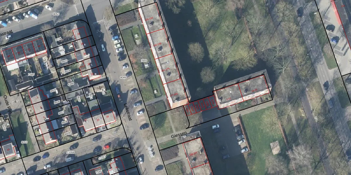 Lekstraat 187 is gelegen op kadastraal perceel APD01L7643. Deze kadastrale aanduiding is uniek en wordt gebruikt door het Kadaster om eigendomsrechten en andere zakelijke rechten vast te leggen. Het perceel maakt onderdeel uit van de kadastrale gemeente Apeldoorn.
