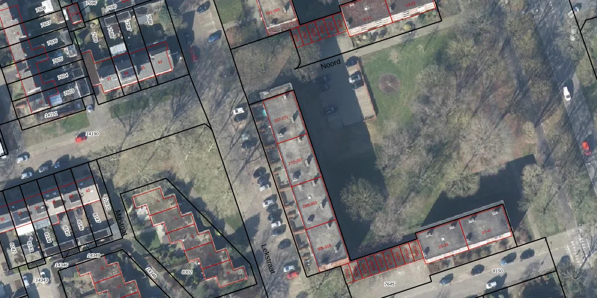 Lekstraat 283 is gelegen op kadastraal perceel APD01L7645. Deze kadastrale aanduiding is uniek en wordt gebruikt door het Kadaster om eigendomsrechten en andere zakelijke rechten vast te leggen. Het perceel maakt onderdeel uit van de kadastrale gemeente Apeldoorn.