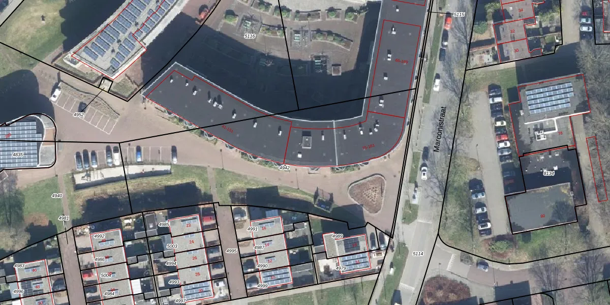 Het perceel waarop Marconistraat 81 staat heeft een oppervlakte van 2928 m². Dit is een zeer groot perceel. De perceeloppervlakte wordt geregistreerd door het Kadaster. Gedetailleerde informatie over de maten van dit perceel kunt u vinden in het rapport Kadastrale kaart met maatvoering van Marconistraat 81.