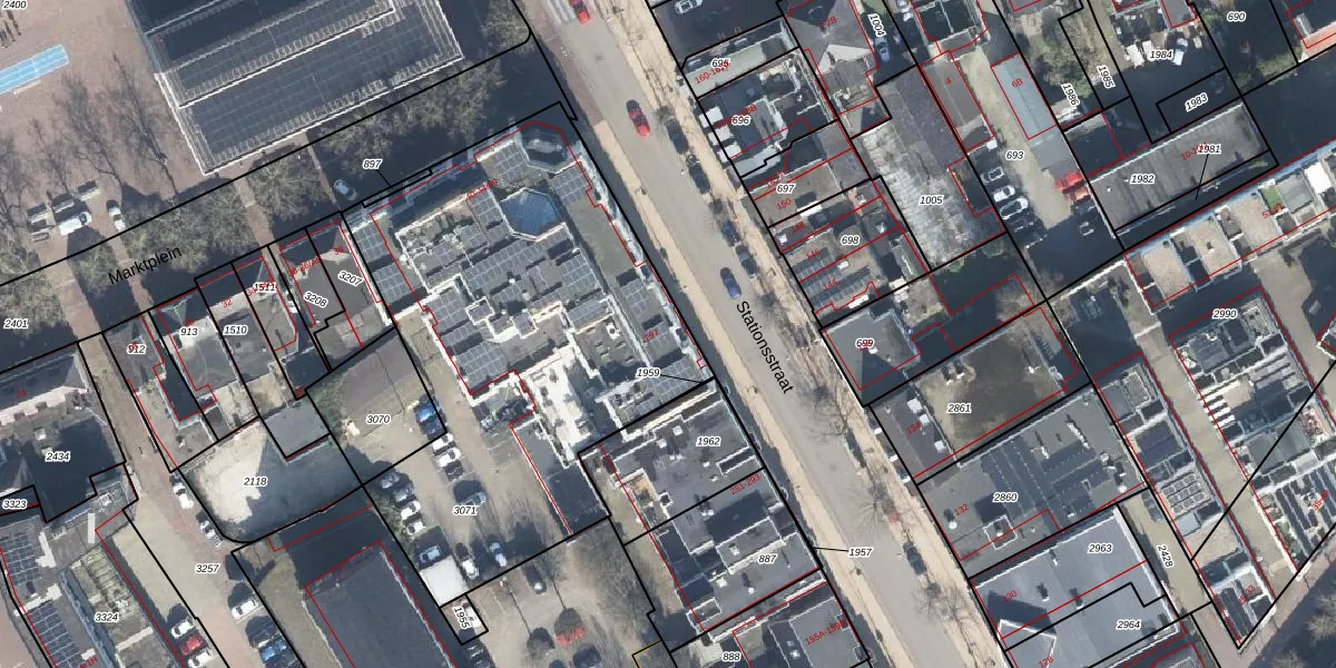 Het perceel waarop Marktplein 44-33 staat heeft een oppervlakte van 2295 m². Dit is een zeer groot perceel. De perceeloppervlakte wordt geregistreerd door het Kadaster. Gedetailleerde informatie over de maten van dit perceel kunt u vinden in het rapport Kadastrale kaart met maatvoering van Marktplein 44-33.