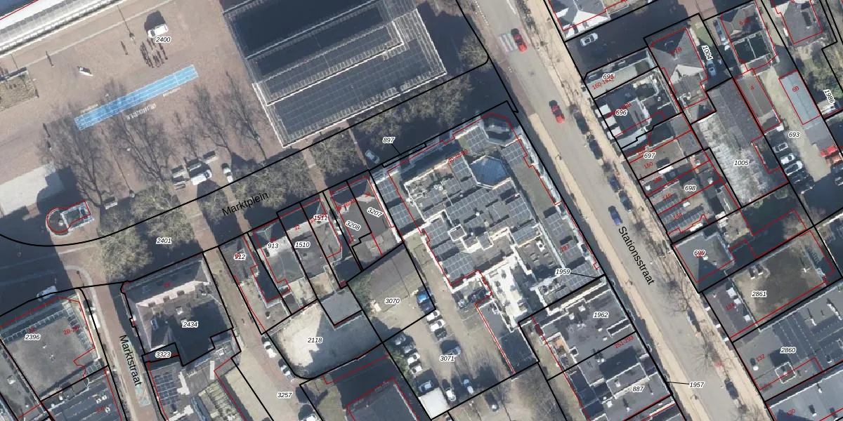 Het perceel waarop Marktplein 44-44 staat heeft een oppervlakte van 2295 m². Dit is een zeer groot perceel. De perceeloppervlakte wordt geregistreerd door het Kadaster. Gedetailleerde informatie over de maten van dit perceel kunt u vinden in het rapport Kadastrale kaart met maatvoering van Marktplein 44-44.