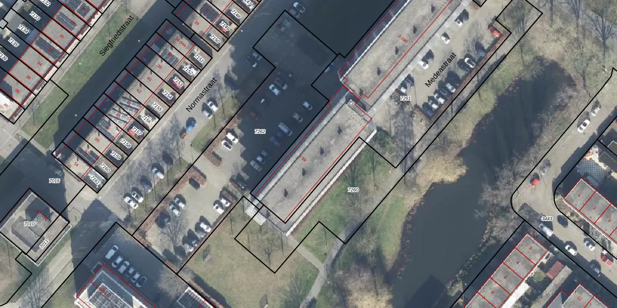 Het perceel waarop Normastraat 35 staat heeft een oppervlakte van 2682 m². Dit is een zeer groot perceel. De perceeloppervlakte wordt geregistreerd door het Kadaster. Gedetailleerde informatie over de maten van dit perceel kunt u vinden in het rapport Kadastrale kaart met maatvoering van Normastraat 35.