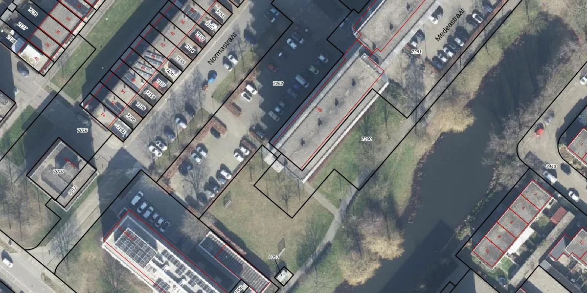 Het perceel waarop Normastraat 49 staat heeft een oppervlakte van 2682 m². Dit is een zeer groot perceel. De perceeloppervlakte wordt geregistreerd door het Kadaster. Gedetailleerde informatie over de maten van dit perceel kunt u vinden in het rapport Kadastrale kaart met maatvoering van Normastraat 49.